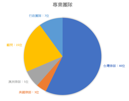 我們的團隊包含 40 位台灣律師、 3 位美國律師、 5 位澳洲律師、 15 位顧問及 7 位行政 團隊。
